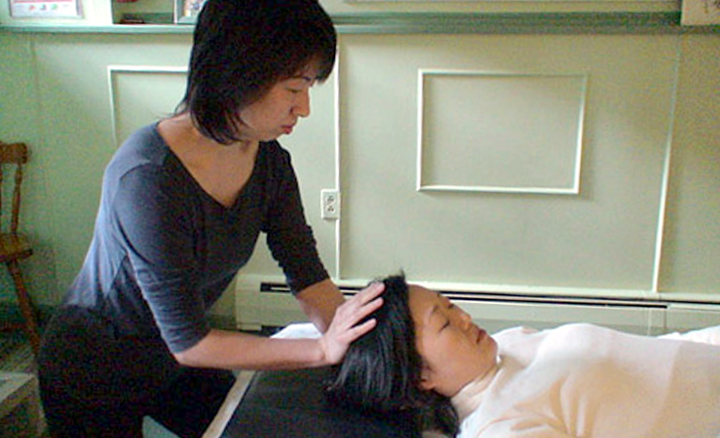 (3)テーブルにゆったりと横になり、無意識に行なっている緊張が解放されるように、指導者が丁寧に体を操作すること。