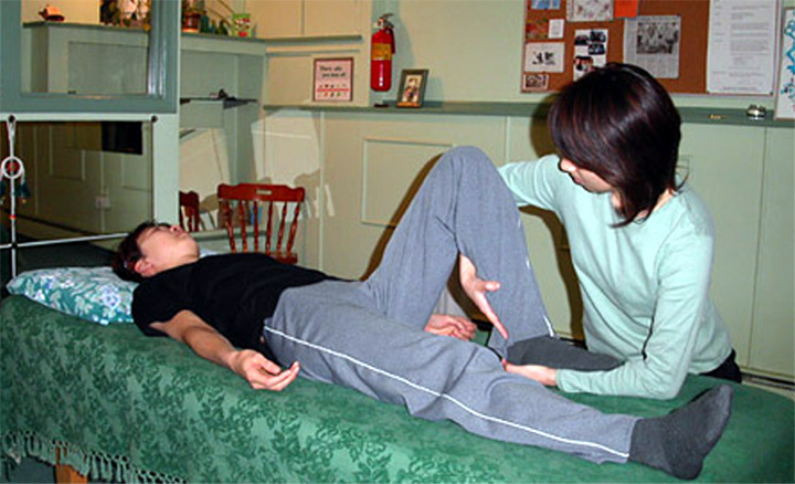 (3)テーブルにゆったりと横になり、無意識に行なっている緊張が解放されるように、指導者が丁寧に体を操作すること。